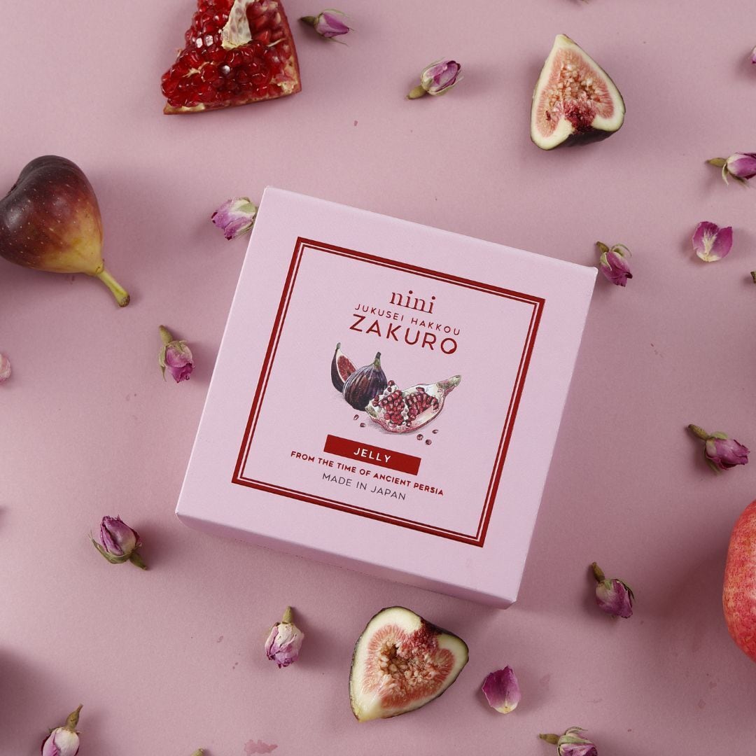 「熟成発酵ザクロゼリー(ザクロ・イチジク・ダマスクローズ)」は、熟成発酵ザクロペースト同様に砂糖不使用です。nini独自技術により、ザクロの酸味とイチジクのやさしい甘み、ダマスクローズの香りの余韻がからだと心に溶け込むインナーケアゼリー※2です。